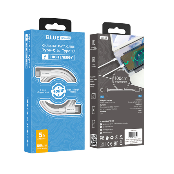 BLUE POWER TYPE C TO TYPE C DATA CABLE 1m 5A white