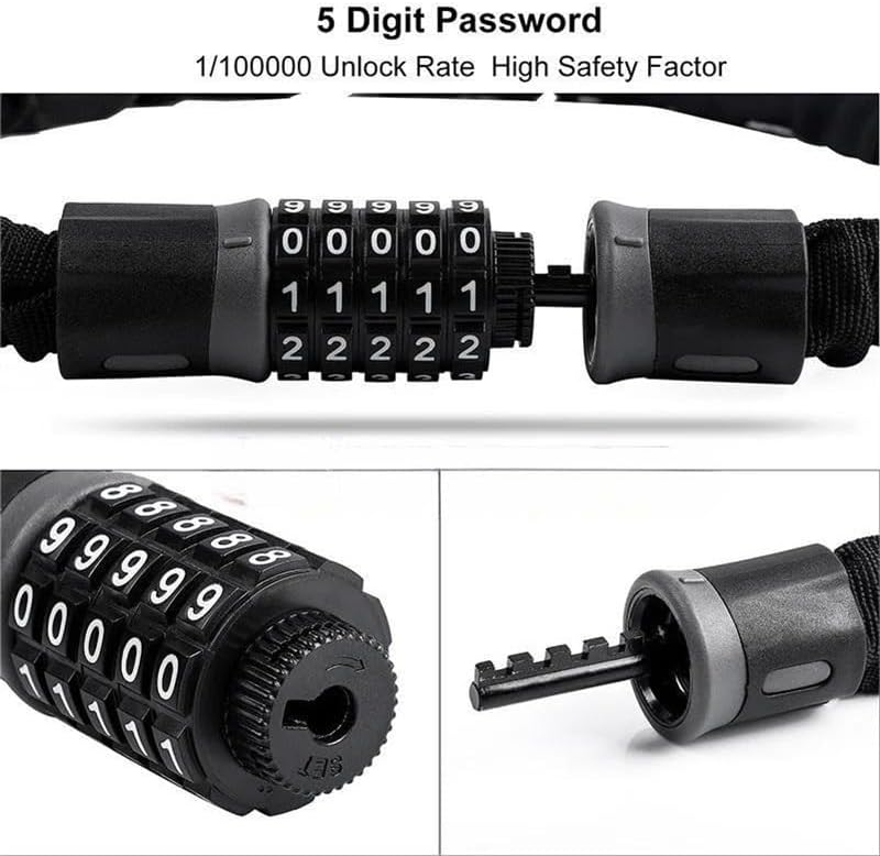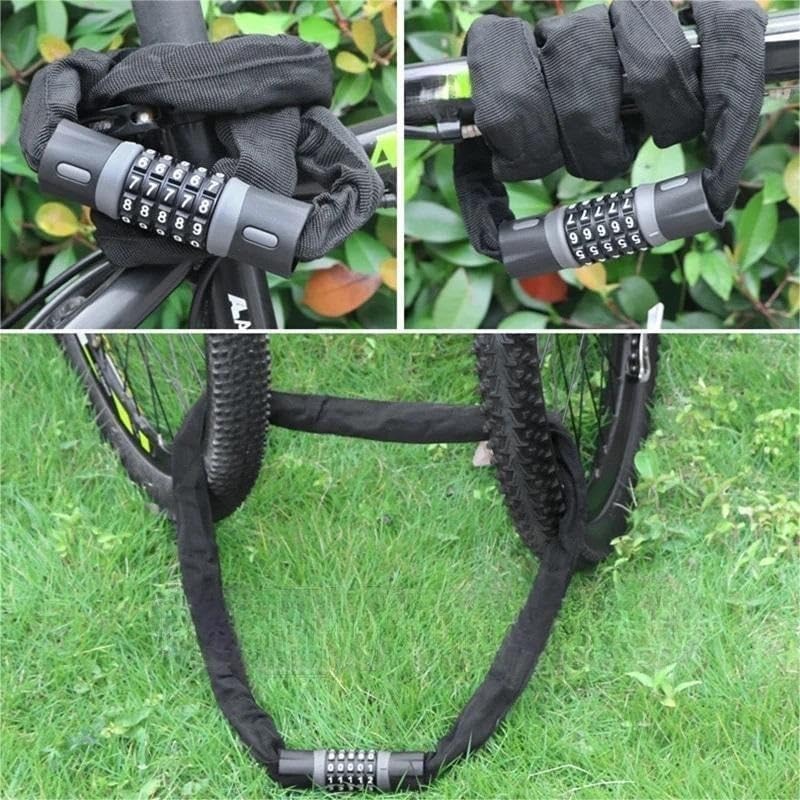 Αλυσίδα κλειδώματος ποδηλάτου με κωδικό ασφαλείας 5 ψηφίων, ατσάλινη, με υφασμάτινη προστατευτική επένδυση για να μην χαράζει την ζάντα.Μήκος: 120cmΠάχος αλυσίδας: 1.8cm