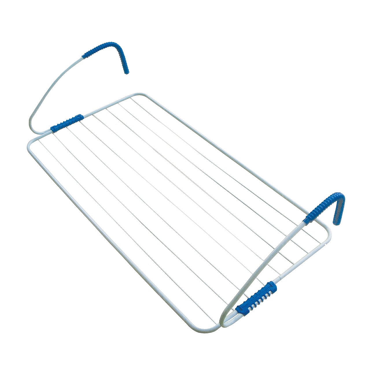 Απλώστρα κρεμαστή από μέταλλο σε λευκό χρώμα και πλαστικά προστατευτικά μπλε χρώματος, για το μπαλκόνι. -Η χρωματική απόδοση του προϊόντος ενδέχεται να διαφέρει ελαφρώς σε σχέση με την φωτογραφική απεικόνισή του στην οθόνη σας. Συνολική επιφάνεια απλώματος 10m.