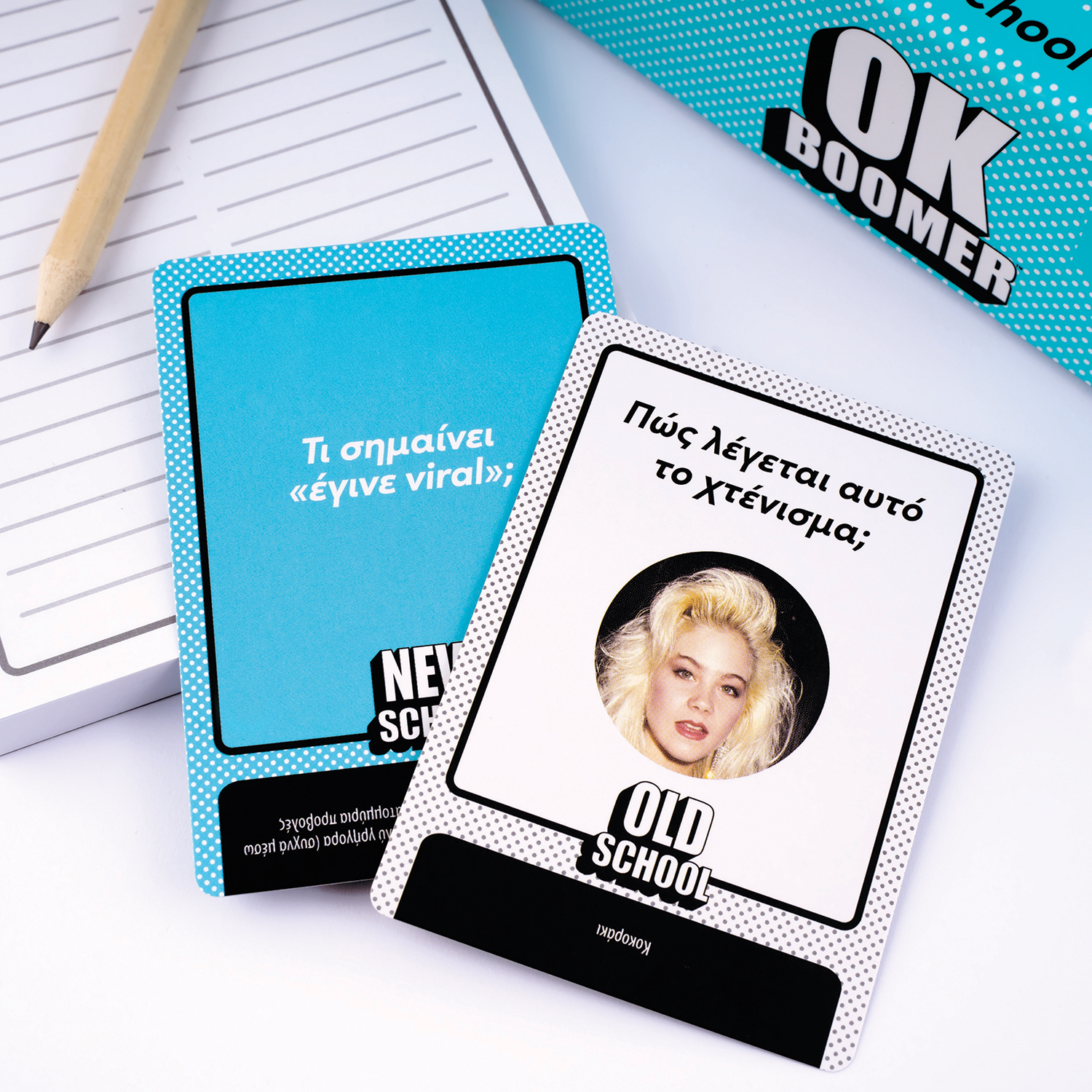 Old School VS New School trivia game! Δοκιμάστε τις γνώσεις σας σχετικά με θέματα που αφορούν τη γενιά της αντίπαλης ομάδας. Παίξτε σε ομάδες βάσει γενεών ή αν είστε όλοι στην ίδια ηλικία, παίξτε ατομικά! Ένα απίστευτα διασκεδαστικό παιχνίδι γνώσεων, διαφορετικό από όσα κυκλοφορούν αφού περιέχει εικονογραφημένες κάρτες και καθόλου βαρετές ερωτήσεις! – Old School: Περιλαμβάνει τους λεγόμενους Boomers και τη γενιά Χ. Ή αλλιώς, όσους και όσες γεννήθηκαν πριν από το 1980. – New School: Περιλαμβάνει τους λεγόμενους Millennials και τη γενιά Z. Ή αλλιώς, όσους και όσες γεννήθηκαν από το 1980 και μετά. Εσύ σε ποια γενιά ανήκεις; Πόσα γνωρίζεις για την αντίπαλη γενιά; Αριθμός Παικτών: 2-8 Καταλληλότητα Ηλικίας: 16+ Χρονών Το παιχνίδι περιλαμβάνει Κάρτες ερωτήσεων Μπλοκ βαθμολογίας Μολύβια