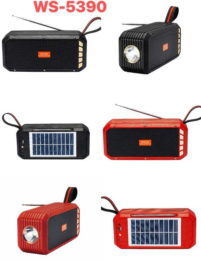 Ασύρματο, επαναφορτιζόμενο ηχείο Bluetooth WS5390 με καθαρό στερεοφωνικό ήχο. Διαθέτει εργονομικό σχεδιασμό και πρακτική λαβή μεταφοράς ενώ διαθέτει και πλαϊνό φακό LED. Διαθέτει, επίσης, ηλιακό πάνελ φόρτισης για έξτρα αυτονομία μπαταρίας. Ιδανικό για χρήση σε εξωτερικές δραστηριότητες.Χαρακτηριστικά:Ισχύς: 14WΕμβέλεια μετάδοσης Bluetooth: 10mΜπαταρία: 1500mAhΧρόνος λειτουργίας: έως 3 ώρες (σε μέση ένταση)Τάση φόρτισης: 5V / 500MASNR: ≥90dbΣυχνότητα: 120hz-20khzΔιαστάσεις: 11 x 24 x 8.5cm