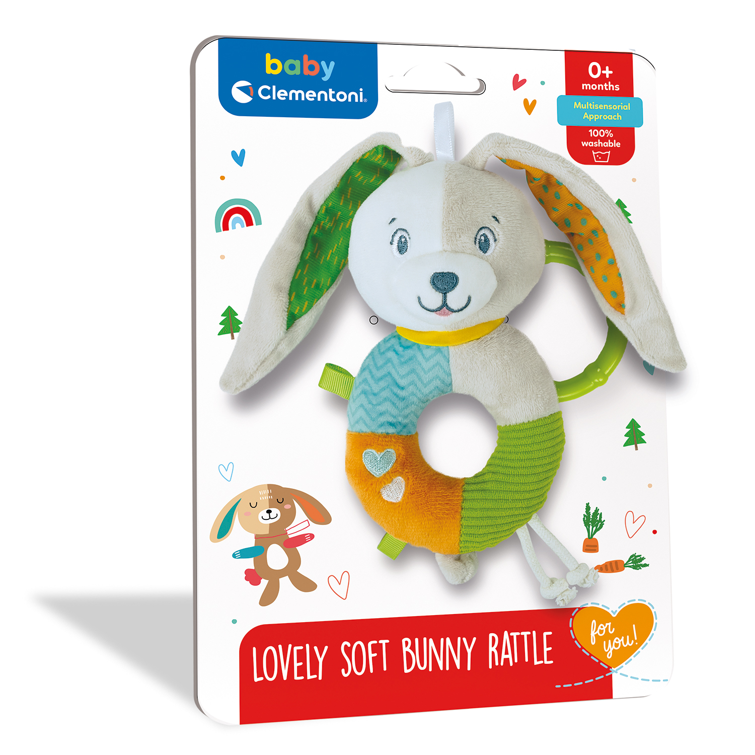 Μία απαλή κουδουνίστρα λαγουδάκι για αγκαλιά! Το λαγουδάκι έχει εύκολη λαβή, ιδανική για μικρά παιδιά. Με διαφορετικά υφάσματα και έντονα χρώματα υποστηρίζει την ανάπτυξη της οπτικής αντίληψης, της ακοής και της επιδεξιότητας. Χάρη στον πρακτικό κρίκο μπορεί να τοποθετηθεί σε πολλά σημεία, να κρεμαστεί οπουδήποτε και να το έχετε πάντα μαζί σας. Tα προϊόντα της σειράς Baby Clementoni For You, είναι ειδικά σχεδιασμένα για να συμβάλλουν στη σωστή ανάπτυξη του μωρού σας από τους πρώτους μήνες της ζωής του. Τα χρώματα, οι διαφορετικοί ήχοι, η υφή και η μουσική των παιχνιδιών προκαλούν έντονα το ενδιαφέρον του μωρού. Κεντρίζουν το ενδιαφέρον του και το βοηθούν να ανακαλύπτει τον κόσμο, να νιώθει ασφάλεια και οικειότητα στον χώρο του, αλλά και να ηρεμεί. Τα παιχνίδια της σειράς Baby Clementoni For You, αποτελούν εργαλεία που ενθαρρύνουν την αλληλεπίδραση μεταξύ των γονιών και του παιδιού, και παρέχουν τη γνωστική και συναισθηματική ανάπτυξη του μωρού στη χρήση διαφορετικών υλικών και λειτουργιών. Τα παιχνίδια της σειράς Baby Clementoni βοηθούν τους γονείς να επικοινωνούν και να αλληλεπιδρούν με το μωρό από τις πρώτες ημέρες της ζωής του. Με καινοτόμο σχεδιασμό και χρώματα, μη τοξικά και ανθεκτικά υλικά, καθώς και με ανάγλυφες επιφάνειες και πολλές δραστηριότητες ευνοούν την ανάπτυξη των οπτικών, απτικών και ακουστικών ικανοτήτων, την κινητική δραστηριότητα και τους πρώτους λογικούς συσχετισμούς.