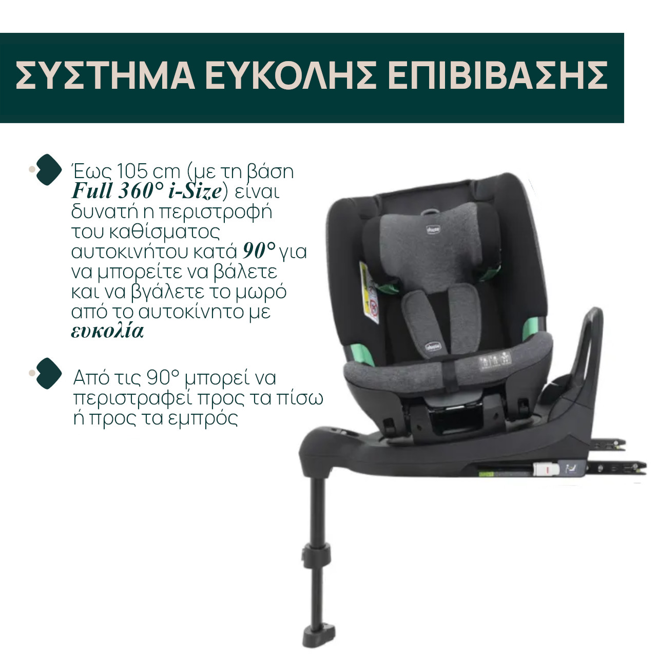 Chicco Καθισματάκι Αυτοκινήτου Bi-Seat i-Size Air Χωρίς Βάση για Παιδί 61-150 cm Black – Το Bi-Seat i-Size είναι το πρώτο μετατρέψιμο κάθισμα αυτοκινήτου από 4 μηνών έως 12 ετών σε συνδυασμό με τη βάση Full 360 i-Size. Ιδανικό μετά τη χρήση του καθίσματος αυτοκινήτου Kory με την ίδια βάση. Έως 105 cm πρέπει να εγκατασταθεί χρησιμοποιώντας τη βάση Full 360 i-Size που πωλείται ξεχωριστά. – Διπλή εγκατάσταση: με τη βάση “Full 360 i-Size Base” με χρήση του Isofix, του Ποδιού Στήριξης και το σύστημα ζωνών 5 σημείων έως 105 cm/ περίπου 4 ετών. Με τη ζώνη του οχήματος από 100 cm (αφαιρώντας τη βάση). – Σύστημα εύκολης επιβίβασης για εύκολη τοποθέτηση μωρού χάρη στην περιστροφή του καθίσματος προς τους γονείς με φορά προς τα πίσω ή προς τα εμπρός. – Μπορεί να χρησιμοποιηθεί με φορά προς τα πίσω έως 105 cm / περίπου 4 ετών. Μπορεί επίσης να χρησιμοποιηθεί με φορά προς τα εμπρός από 15 μηνών. – Σύστημα εύκολης ανάκλισης σε 5 διαφορετικές θέσεις με φορά προς τα πίσω και προς τα εμπρός για ξεκούραστες μετακινήσεις. Προειδοποιήσεις και οδηγίες Διαβάστε προσεκτικά τις ετικέτες και τις προειδοποιήσεις στη συσκευασία του προϊόντος πριν από τη χρήση.