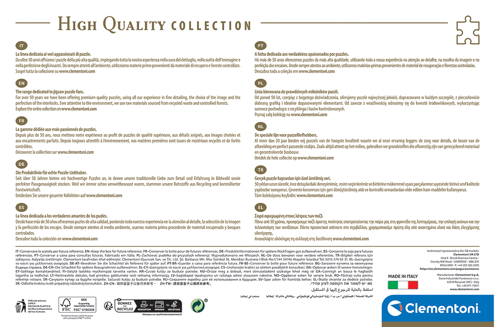 Clementoni Παζλ 2000 τεμαχίων της σειράς High Quality Collection με θέμα Λονδίνο Θέα Από Ψηλά. Οι πιο ελκυστικές εικόνες, η μεγαλύτερη ποικιλία μεγεθών και η χαρακτηριστική ποιότητα Clementoni για τη σειρά High Quality Collection, που αποτελεί χρυσό πρότυπο για τους λάτρεις των παζλ παντού. Συντονισμένα με τη σημασία της περιβαλλοντικής ευαισθητοποίησης, τα παζλ Clementoni φτιάχνονται με εκτεταμένη χρήση ανακυκλωμένων υλικών, αποφεύγοντας παράλληλα τη χρήση από τυχόν συστατικά που περιέχουν ρύπους. – Τεμάχια Παζλ: 2000 – Σειρά: High Quality Collection – Διαστάσεις Ολοκληρωμένου Παζλ: 97.5×66.8cm – Κατασκευάζεται στην Ιταλία – Τυπωμένο σε αντιθαμβωτικό χαρτί – Κομμάτια από χοντρό ανθεκτικό χαρτόνι