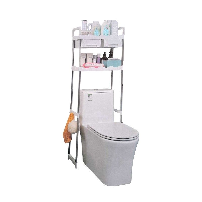 Επιδαπέδια ραφιέρα μπάνιου με μεταλλικό σκελετό, συναρμολογούμενη, με 2 πρακτικά ράφια, πλαϊνές κρεμάστρες και 2 συρτάρια, ιδανική για οργάνωση και εξοικονόμηση χώρου καθώς τοποθετείται επάνω από τη λεκάνη τουαλέτας. Διαστάσεις: 50.5 × 25 x 150 cm.