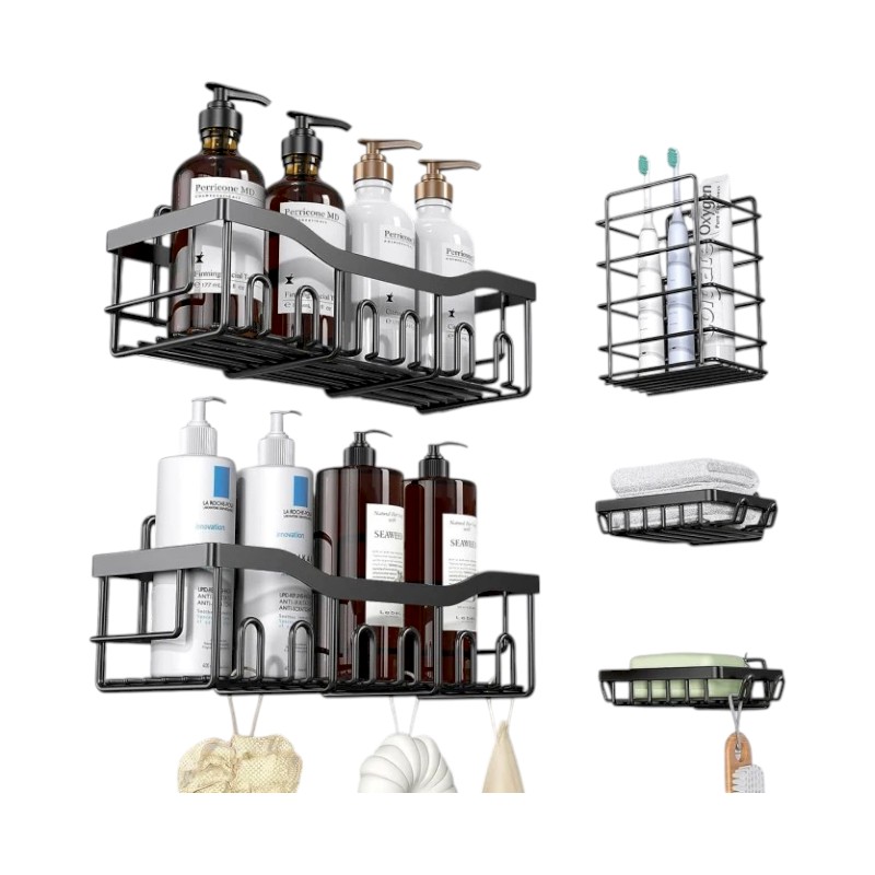 Σετ επιτοίχια ράφια οργάνωσης μπάνιου, με 2 ράφια, 2 θήκες σαπουνιού/σφουγγαριού και 1 θήκη για οδοντόβουρτσες.Τα ράφια διαθέτουν πρακτικά κρεμαστράκια για κρέμασμα πολλαπλών αξεσουάρ. Μπορούν να τοποθετηθούν τόσο στο μπάνιο όσο και στην κουζίνα σας. Μεταλλική κατασκευή υψηλής ανθεκτικότητας.Τοποθετούνται επιτοίχια με ισχυρό αυτοκόλλητο (περιλαμβάνεται).Διαστάσεις:Ράφι 1: 30 x 11 x 11cmΡάφι 2: 32 x 10 x 13cmΣαπουνοθήκες: 14 x 5 x 10cmΘήκη οδοντόβουρτσας: 10 x 14 x 8cm