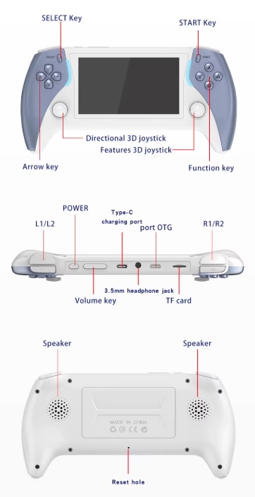 Φορητή κονσόλα παιχνιδιών με έως 10000 διαφορετικά retro παιχνίδια που λάτρεψαν μικροί και μεγάλοι (Contra , Turtles, Tank, Bomber Man κτλ.) για ατελείωτο Gaming!Χαρακτηριστικά:Επεξεργαστής CPU: RK3326,Cortex-A35 up to 1.5GHzΟθόνη TFT 4.3″ HD IPS 800*480Επαναφορτιζόμενη μπαταρία 3200 mahΕνσωματωμένα ηχείαΑυτονομία μπαταρίας: έως 5 ώρες Μνήμη ROM: eMMC 8GB Μνήμη RAM: LPDDR3 1GB Υποστήριξη κάρτας μνήμης έως 128GBΥποστήριξη σύνδεσης με TVΥποδοχές: OTG, TF Card, Jack 3.5mm, Φόρτισης Type-C.Υποστηριζόμενες μορφές παιχνιδιών: PS1、MAME、ND、N64、CPS、NEOGEO、GBA、GBC、GB、SFC、FC、MD,ATARI、DC、PCE、GGΤάση εισόδου: 5V/2AΔιαστάσεις: 20 x 10 x 2.5cmΠεριλαμβάνεται καλώδιο φόρτισης.