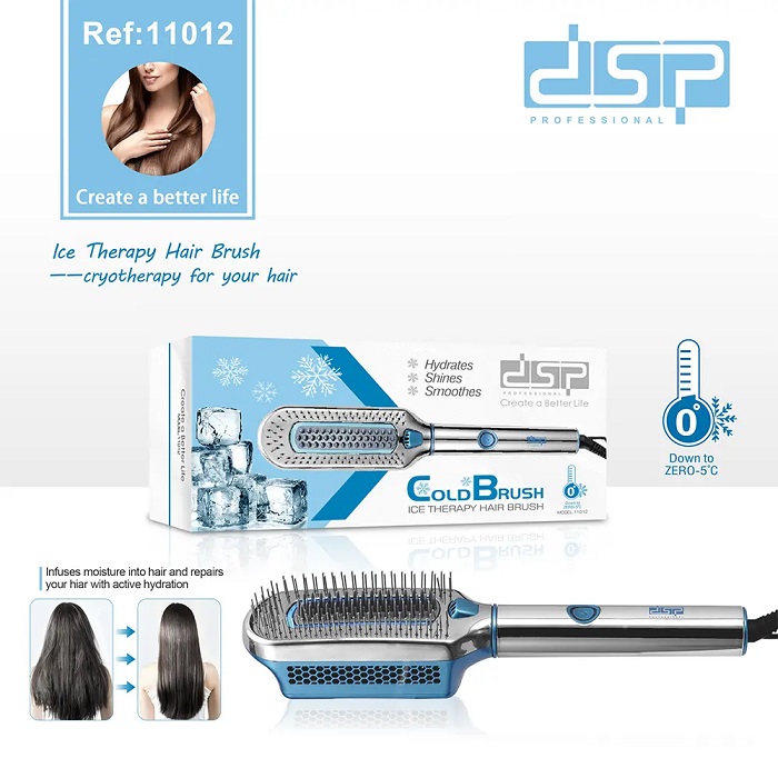 Ηλεκτρική βούρτσα κρυοθεραπείας και χτενίσματος μαλλιών DSP με τεχνολογία Ice Therapy και Nano ionic που προσφέρει μία επαγγελματική θεραπεία επαναφοράς των μαλλιών στην άνεση του σπιτιού σας, για υγιή, δυνατά και λαμπερά μαλλιά χωρίς ίχνος φθοράς, με ελάχιστο κόπο και χρήματα. Κατάλληλη για βρεγμένα ή στεγνά μαλλιά.Freezing point temperature/Θερμοκρασία κρυοθεραπείας: έως -5°C. Ισχύς 36W, Κεραμική επίστρωση επιφάνειας, Ψηφιακή οθόνη LED, Κουμπί On/Οff, Λυχνία Blue LED, Τάση 220-240V~50/60Hz, Αυτόματη απενεργοποίηση μετά από μισή ώρα, Περιστρεφόμενο καλώδιο 360° μοιρών. Τάση: 220-240V~50/60Hz. Μήκος καλωδίου: 1.8m. Κρεμάστρα.Εμπεριέχονται οδηγίες χρήσης στα Αγγλικά.