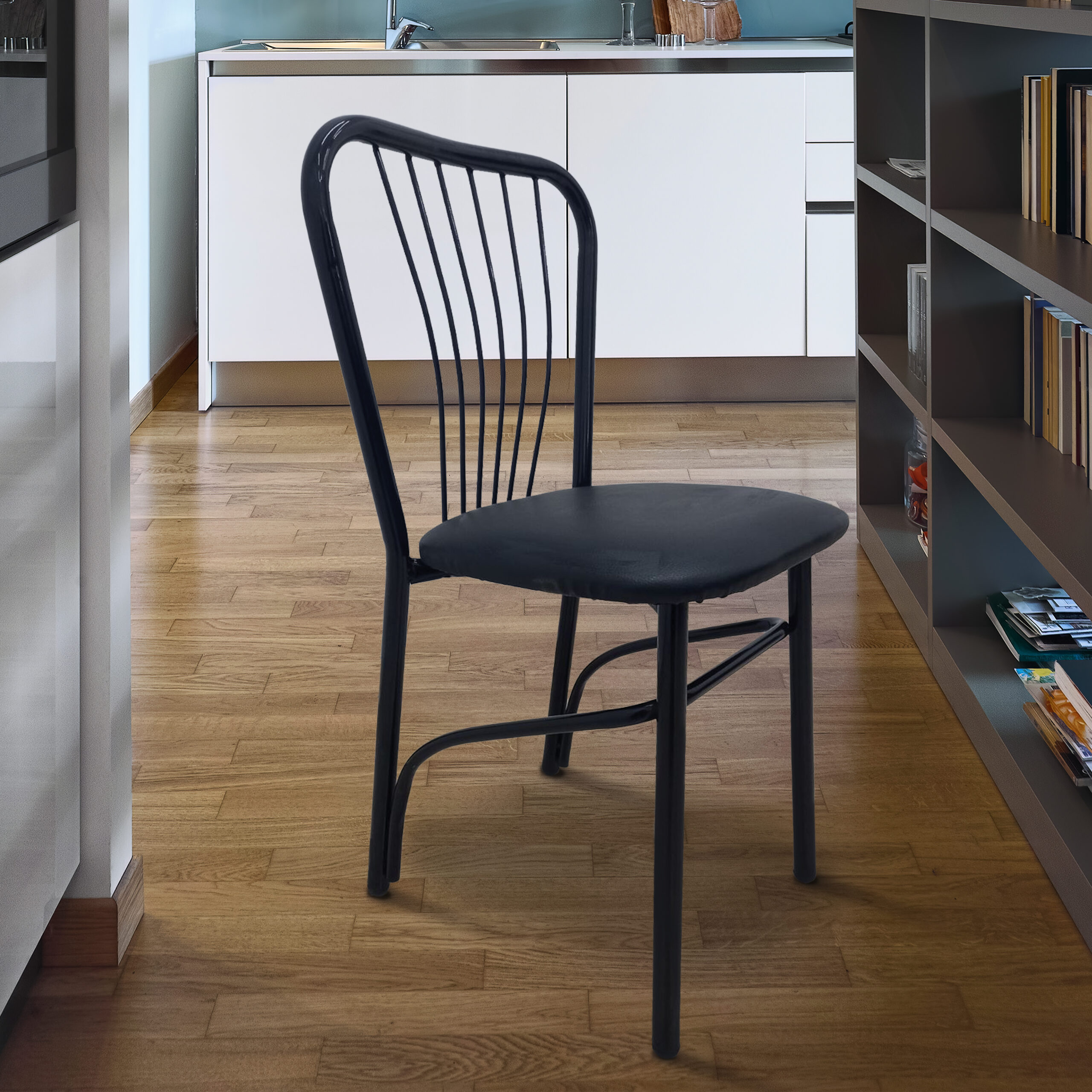 Καρέκλα κατασκευασμένη από μέταλλο εξαιρετικής ποιότητας επενδυμένη με τεχνόδερμα σε μαύρο χρώμα.Ιδανική και πρακτική επιλογή που θα ανανεώσει τη διακόσμηση του χώρου που θα την τοποθετήσετε και θα βοηθήσει στην οργάνωσή του. Κατάλληλη για τον προσωπικό και τον επαγγελματικό σας χώρο. Σημείωση: Το προϊόν παραδίδεται μονταρισμένο, όπως απεικονίζεται στη φωτογραφία.-Η χρωματική απόδοση του προϊόντος ενδέχεται να διαφέρει ελαφρώς σε σχέση με την φωτογραφική απεικόνισή του στην οθόνη σας. Διαστάσεις:39x36x84εκ.Ύψος έδρας:47εκ.