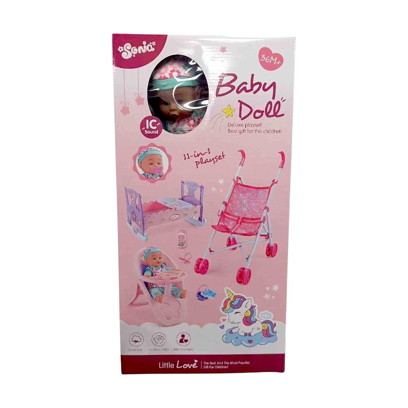 Πλήρες σετ φροντίδας μωρού με κούκλα, κρεβατάκι, καρεκλάκι φαγητού, καροτσάκι και όλα τα απαραίτητα αξεσουάρ για την ολοκληρωμένη φροντίδα και την περιποίηση του μωρού σου!Διαστάσεις: 52 x 65 x 30cm.Πληροί όλα τα πρότυπα ασφαλείας. Κατάλληλο για παιδιά ηλικίας 3 ετών και άνω.