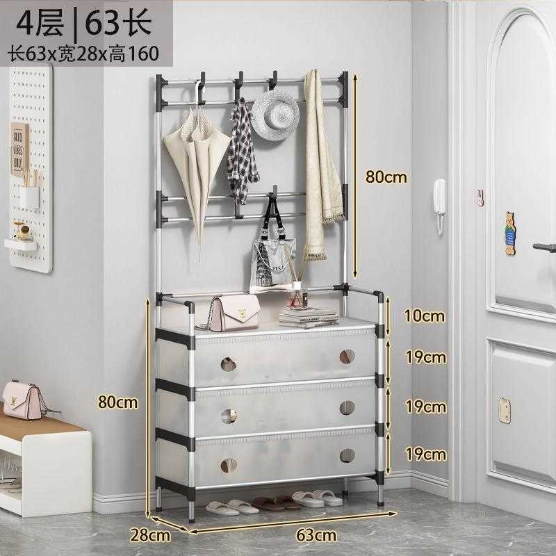 Κρεμάστρα δαπέδου με μεταλλικό σκελετό και συρταρωτές θήκες παπουτσιών και αξεσουάρ με λεπτή, πλαστική, εύκαμπτη πρόσοψη, ιδανική ως έπιπλο εισόδου ή για την οργάνωση των ρούχων στο δωμάτιό σας. Διαστάσεις: 160 x 63 x 28 cm.