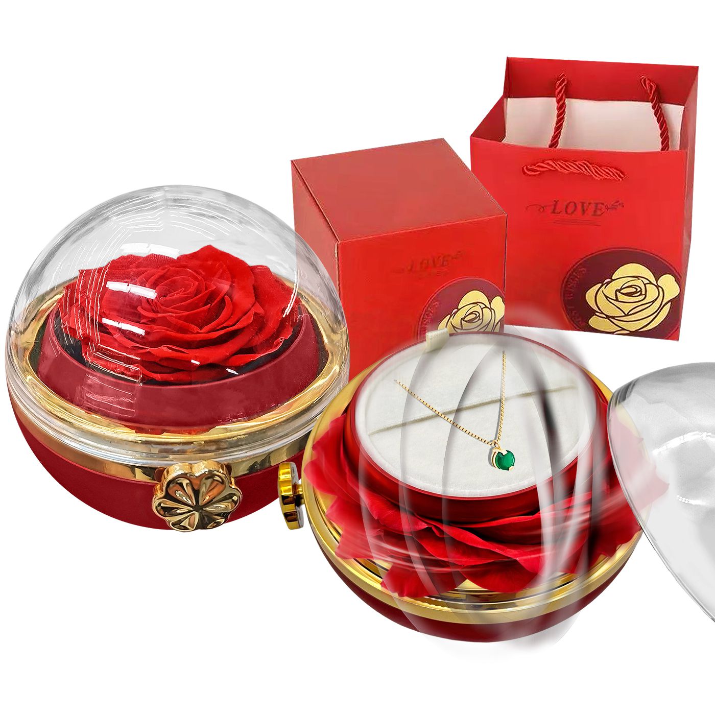 Παντοτινό τριαντάφυλλο αληθινό. Διάρκεια ζωής άνω των 5 ετών. Περιστρεφόμενο με κουμπί για να εμφανιστεί κόσμημα (δε περιέχει κόσμημα). ø11cm