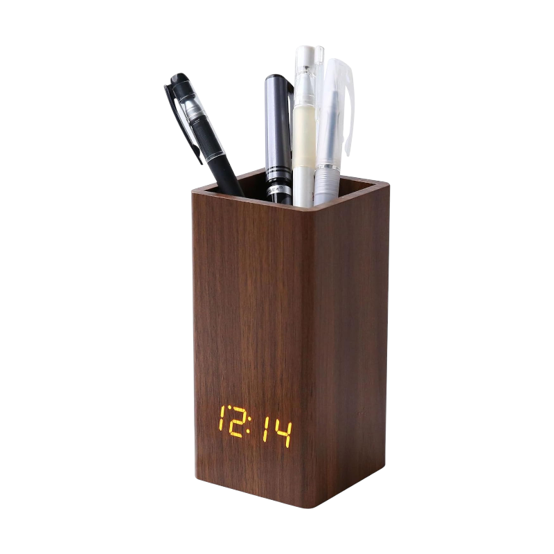 Ψηφιακό ρολόι–Ξυπνητήρι LED & μολυβοθήκη, σε ιδιαίτερο σχεδιασμό με εφέ ξύλου. Πρακτικό μέγεθος που μπορεί να τοποθετηθεί παντού και να προσδώσει σύγχρονη νότα στο χώρο σας.Διαθέτει ξυπνητήρι με λειτουργία snooze Ενδείξεις: ΏραΗμερομηνία ΘερμοκρασίαΤροφοδοσία με μπαταρίες 3 x AAA (δεν περιλαμβάνονται) ή μέσω καλωδίου USB 5V (περιλαμβάνεται)Διαστάσεις: 7 * 7* 14.3 cm.