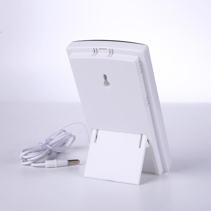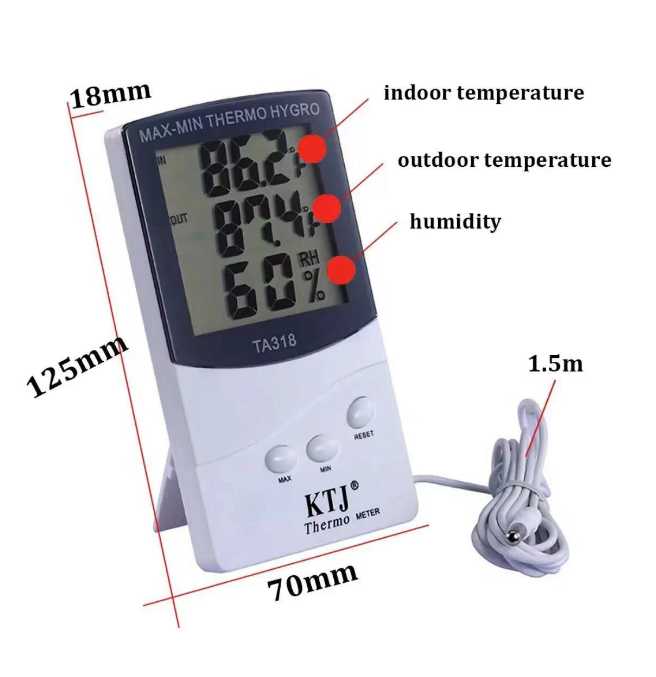 Ψηφιακό θερμόμετρο/υγρόμετρο δωματίου με μεγάλη ευανάγνωστη οθόνη LCD. Με ενσωματωμένο αισθητήρα για την ένδειξη των συνθηκών στον εσωτερικό σας χώρο, ενώ διαθέτει καλώδιο με αισθητήρα που μπορεί να τοποθετηθεί έξω από το παράθυρο σας ώστε να σας παρέχει ενημέρωση και για τις εξωτερικές συνθήκες θερμοκρασίας/υγρασίας.Τοποθετείται επιτραπέζια με την πτυσσόμενη βάση που διαθέτει στο πίσω μέρος του ή και επιτοίχια χάρη στην ειδική οπή για κρέμασμα.Χαρακτηριστικά:Διακόπτης επιλογής ένδειξης θερμοκρασίας σε Κελσίου ή Φαρενάιτ. 3 πλήκτρα επιλογής ένδειξης μέγιστης και ελάχιστης θερμοκρασίας και υγρασίας (Max, Min, Reset).Εύρος θερμοκρασίας εξωτερικού χώρου: -50 έως 70 Κελσίου (-58 έως 158 Φαρενάιτ). Εύρος θερμοκρασίας εσωτερικού χώρου: 0 έως 50 Κελσίου (32 έως 122 Φαρενάιτ). Υλικό: Πλαστικό Ακρίβεια θερμοκρασίας: 0,1 Κελσίου Εύρος υγρόμετρου: 25% RH έως 98% RH Τροφοδοσία: 1 μπαταρία AAA (δεν περιλαμβάνεται) Διαστάσεις: 12.5* 7.0* 1.92cm Μήκος καλωδίου: 1,5 m Βάρος: 110g Χρώμα: λευκό*οι μετρήσεις εξωτερικού και εσωτερικού χώρου δεν μπορούν να εμφανιστούν ταυτόχρονα. Για τις ενδείξεις εξωτερικού χώρου, τοποθετείτε το καλώδιο εκτός σπιτιού για λίγα λεπτά και ελέγχετε τις ενδείξεις που θα εμφανιστούν. Στη συνέχεια και εφόσον μαζέψετε το καλώδιο, θα επανέλθουν οι ενδείξεις του εσωτερικού σας χώρου.