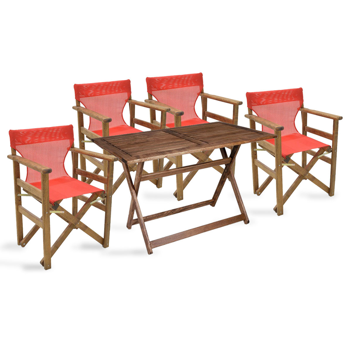 Σετ κήπου πέντε τεμαχίων το όποιο αποτελείται από ένα τραπέζι και τέσσερις πολυθρόνες σκηνοθέτη. Τραπέζι κατασκευασμένο από ενισχυμένο ξύλινο σκελετό σε καρυδί χρώμα και τέσσερις πολυθρόνες σκηνοθέτη από ξύλο φουρνιστής οξιάς και ύφασμα textilene υψηλής ποιότητας και ανθεκτικότητας στον χρόνο σε χρώμα καρυδί με κόκκινο. Μία μοντέρνα επιλογή, η οποία θα σας χαρίσει στιγμές χαλάρωσης και αναπαυτικότητας και θα ομορφύνει τον εξωτερικό χώρο που θα τοποθετηθεί.Σημείωση: Το προϊόν παραδίδεται αμοντάριστο και συσκευασμένο. Περιέχει αναλυτικές οδηγίες συναρμολόγησης. Σε περίπτωση που χρειαστείτε βοήθεια στο μοντάρισμα, το έμπειρο προσωπικό μας είναι στη διάθεση σας, να σας εξυπηρετήσει τηλεφωνικά.Διαστάσεις πολυθρόνας:60x51x86εκ.Ύψος μπράτσων:67εκ.Ύψος καθίσματος:43εκ.Κλειστή:28x51x86εκ.Διαστάσεις καθίσματος:42×39εκ.Διαστάσεις:140x80x75εκ.Κλειστό:140×96εκ.