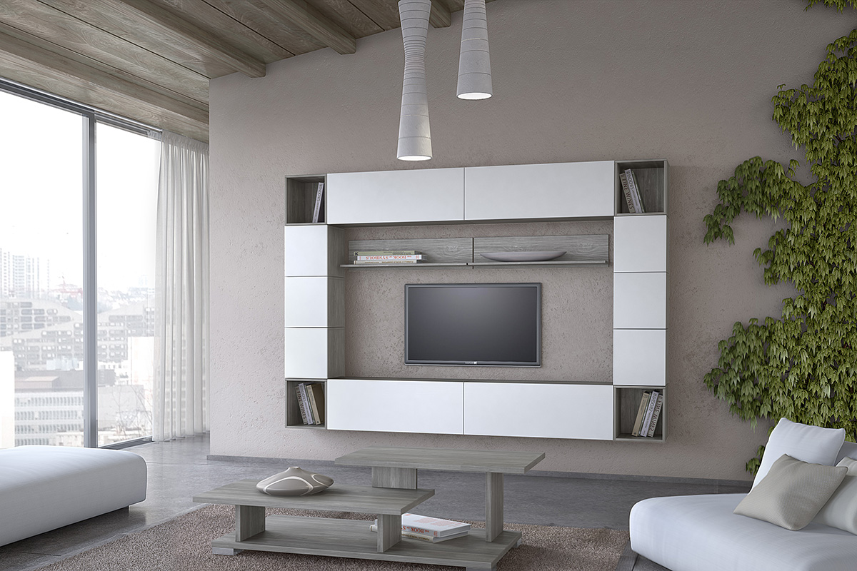 Σύνθεση σαλονιού “SMART 8D” κατασκευασμένη από μελαμίνη άριστης ποιότητας και ανθεκτικότητας. Η σύνθεση περιλαμβάνει 4 κουτιά τοίχου οριζόντια σε σταχτί χρώμα με λευκές πόρτες, 4 κουτιά τοίχου σε σταχτί χρώμα, 6 κουτιά τοίχου σε σταχτί χρώμα με λευκές πόρτες και 2 ράφια σε σταχτί χρώμα. Το σύνθετο σαλονιού είναι μία απαραίτητη επιλογή για να κοσμήσετε το σαλόνι σας καθώς και να τοποθετήσετε τηλεόραση, ηλεκτρονικές συσκευές και διακοσμητικά ή ότι άλλο επιθυμείτε. Το σύνθετο σας δίνει τη δυνατότητα να διαμορφώσετε εσείς το χώρο με βάση τα τεχάμια που διατίθενται.-Ευρωπαϊκής κατασκευήςΣημείωση: Το προϊόν παραδίδεται αμοντάριστο και συσκευασμένο. Σε περίπτωση που χρειαστείτε βοήθεια στο μοντάρισμα, το έμπειρο προσωπικό μας είναι στη διάθεση σας, να σας εξυπηρετήσει τηλεφωνικά.Διαστάσεις:Κουτιά τοίχου οριζόντια: 101x33x26εκ.Κουτιά τοίχου: 35x33x26εκ.Ράφια: 90x18x18εκ.