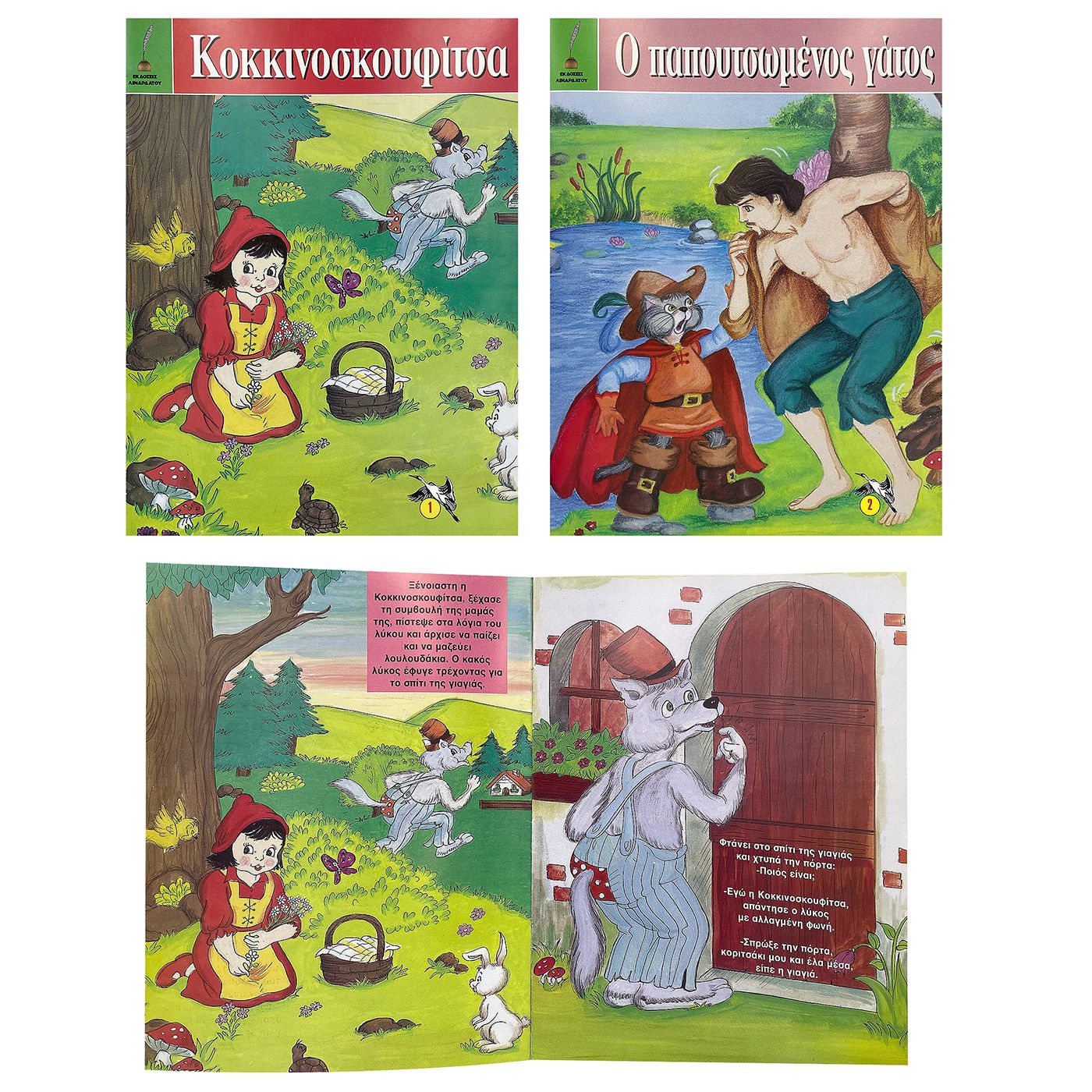 (ασσορτί) η κοκκινοσκουφίτσα, ο παπουτσωμένος γάτος, η χιονάτη & οι 7 νάνοι, ο κοντορεβιθούλης, η σταχτοπούτα, τα 3 γουρουνάκια, το ασχημόπαπο, η ωραία κοιμωμένη, ο πινόκιο, ο λύκος & τα 7 κατσικάκια, το λυχνάρι του αλαντίν, πήτερ παν. 16 σελίδες 21x28cm