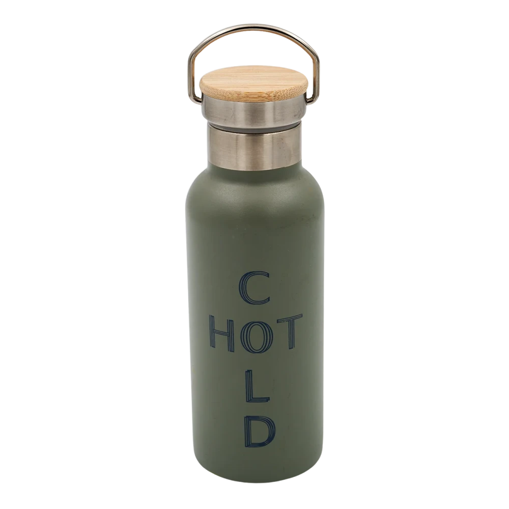 Θερμός 500ml από ανοξείδωτο χάλυβα και καπάκι από μπαμπού με ηλεκτροστατική βαφή σε πράσινο χρώμα. Διατηρεί 12 ώρες κρύο το περιεχόμενο και 6 ώρες ζεστό. Ιδανική και πρακτική επιλογή που θα κρατάει τη θερμοκρασία του καφέ ή του τσαγιού σας.