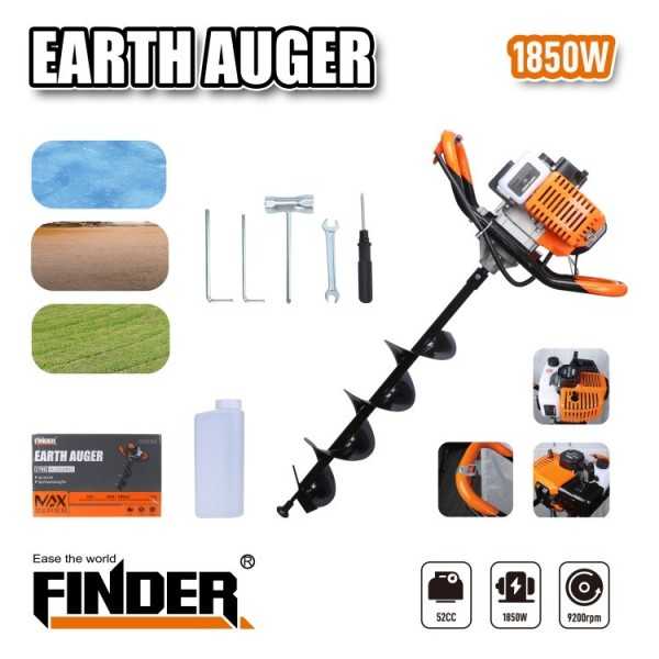 Χαρακτηριστικά:Τύπος: Αερόψυκτος, μονοκύλινδρος, δίχρονοςΚυβισμός: 52ccΙσχύς: 2,5 HP/1850 WΜέγιστες στροφές: 9200 rpm. Αναλογία μείγματος καυσίμου: 1:25Χωρητικότητα δεξαμενής καυσίμου: 1200 mlΔιαστάσεις κοχλία: 150 x 800 mmΚατάλληλο για τρύπημα σε χώμα, ξύλο και γρασίδι. Η FINDER TOOLS είναι ένας ταχέως αναπτυσσόμενος προμηθευτής με μεγάλη τεχνολογική εμπειρία στην κατασκευή εργαλείων. Παράγει Α’ ποιότητας εργαλεία που, σε συνδυασμό με την χαμηλή τιμή και την υψηλή ποιότητα κατασκευής, βρίσκεται στις πρώτες θέσεις προτίμησης, τόσο για τους λάτρεις του DIY όσο και για τους τεχνίτες που αναζητούν την επαγγελματική ποιότητα στην πιο οικονομική επιλογή!