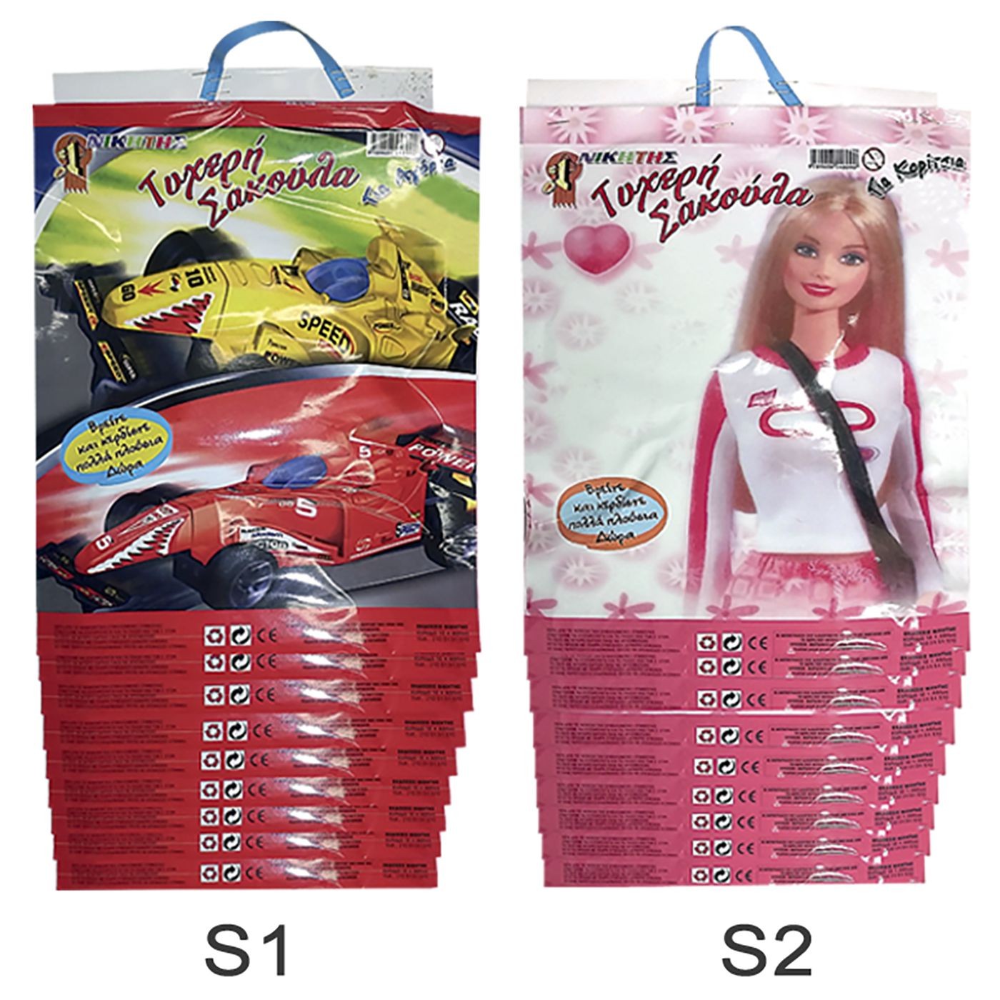 Τυχερή σακούλα (ανά 10άδα για αγόρι ή κορίτσι) των 2€, S1=τυχαίο αγορίστικο σχέδιο, S2=τυχαίο κοριτσίστικο σχέδιο