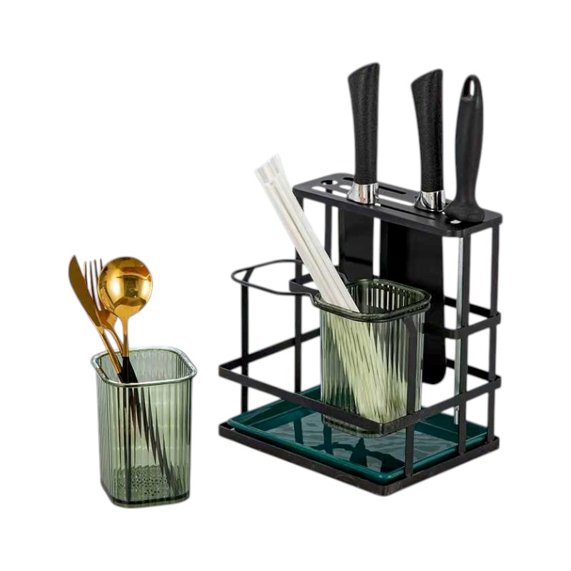 Μεταλλική βάση οργάνωσης και αποστράγγισης μαχαιροπίρουνων, με ειδική θήκη μαχαιριών και γυάλινες αφαιρούμενες θήκες πιρουνιών-κουταλιών. Διαθέτει αφαιρούμενη και πλενόμενη πλαστική βάση συγκέντρωσης νερού.Διαστάσεις: 22 x 18cm