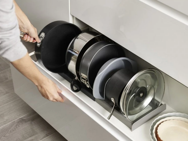 Βάση οργάνωσης σκευών κουζίνας μεταλλική με ρυθμιζόμενο μήκος 31-56cm και διαχωριστικά που μπορούν να τοποθετηθούν ανάλογα με το μέγεθος θέσεως που επιθυμείτε.