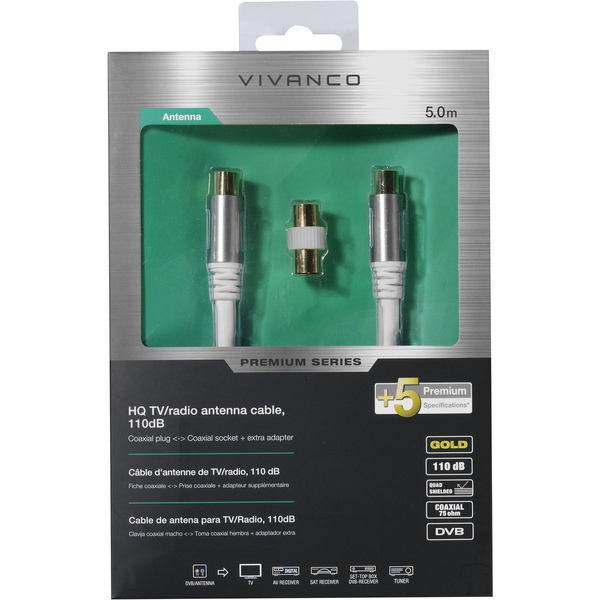 * HQ TV/radio antenna cable, 110dB * coaxial plug coaxial socket * Brilliant signal by avoiding external interferences * Suitable for connection of 4K, UHD, HDR TV devices. * Incl. coaxial-adapter * Gold-plated contacts, metal plug * Multiple shielding * Bending protection