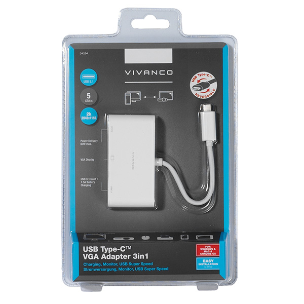 VIVANCO USB TYPE C 3 in 1 ADAPTER VGA / HUB / CHARGING